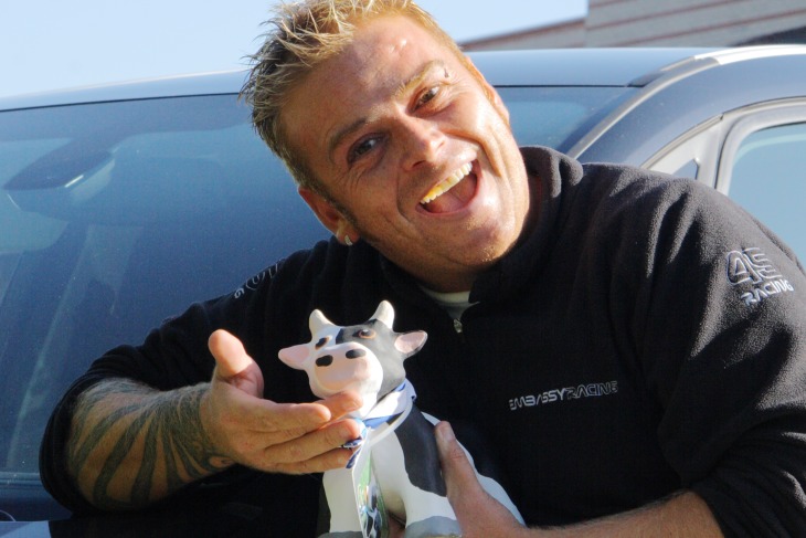 Jim from Horizon Radio holding the Special Scout Edition Mini Concrete Cow #1.